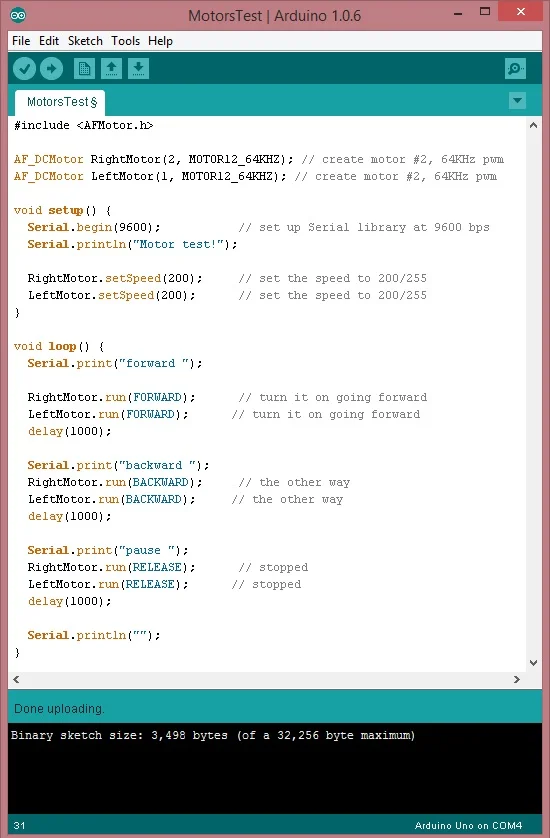 The company Adafruit sold the L293D motor shield kit that is now obsolete, but they still provide its learning documentation, Adafruit Motor Shield, at https://learn.adafruit.com/downloads/pdf/adafruit-motor-shield.pdf and the assembled board can be purchased elsewhere. This test program above came from this reference, please refer to it. The AF_Motor Arduino library (AFMotor.h) must be installed to instruct the Arduino how to talk to the Motor shield. Follow the Adafruit instruction on how to install it into the Arduino IDE. Then, copy, paste, and upload this test program to your Arduino and test your car.